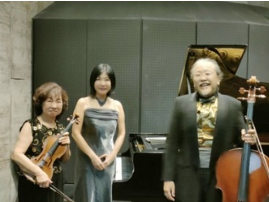 終演後に楽しく演奏中の写真終演後に記念写真 静岡の青嶋ホールで、ヴァイオリニストの篠崎功子さん、チェリストの青嶋直樹さんと「いさなみトリオ」のコンサートでした(トリオのルールで先生と呼ぶのは禁止)。