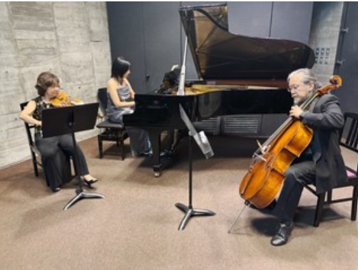 終演後に楽しく演奏中の写真終演後に記念写真 静岡の青嶋ホールで、ヴァイオリニストの篠崎功子さん、チェリストの青嶋直樹さんと「いさなみトリオ」のコンサートでした(トリオのルールで先生と呼ぶのは禁止)。